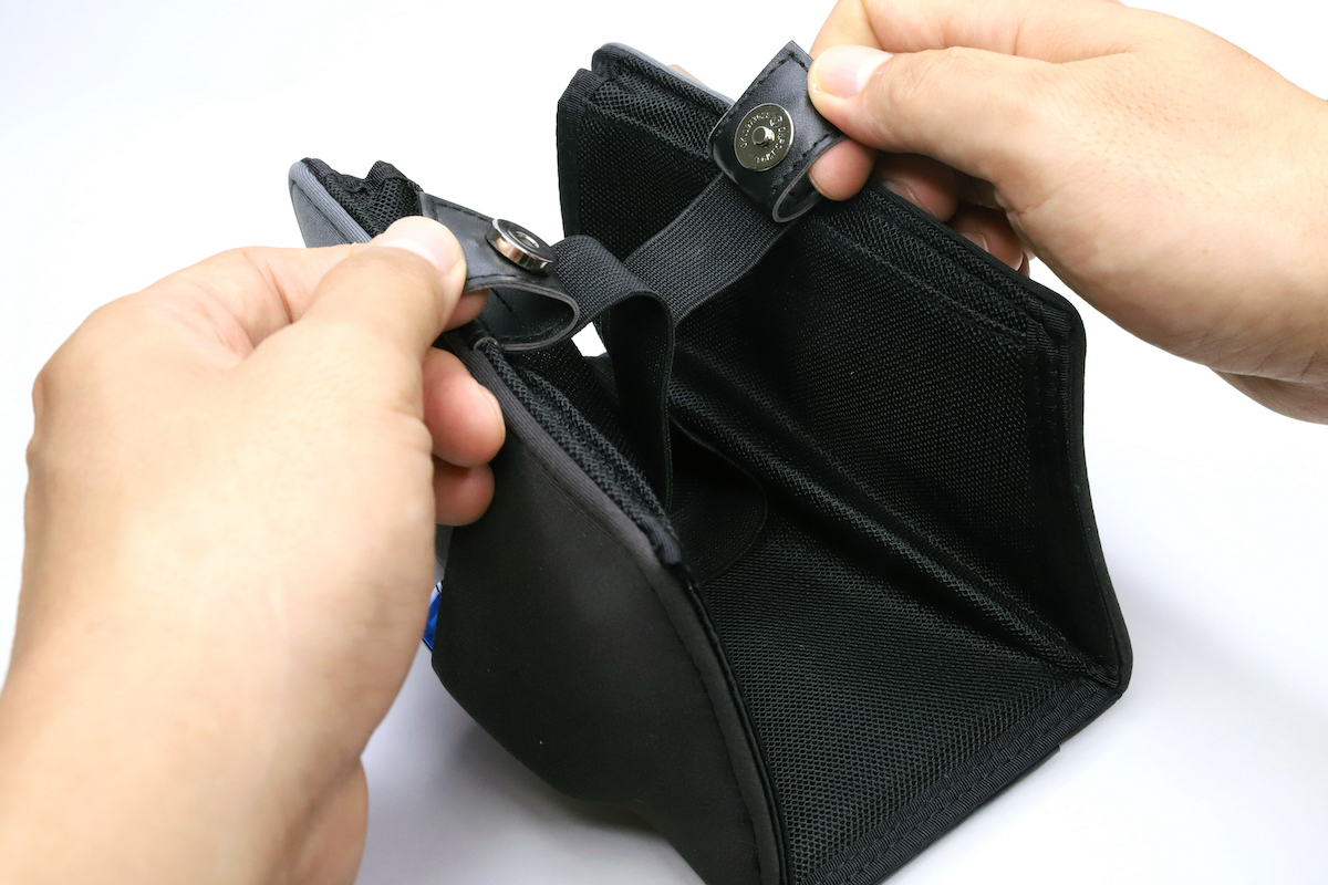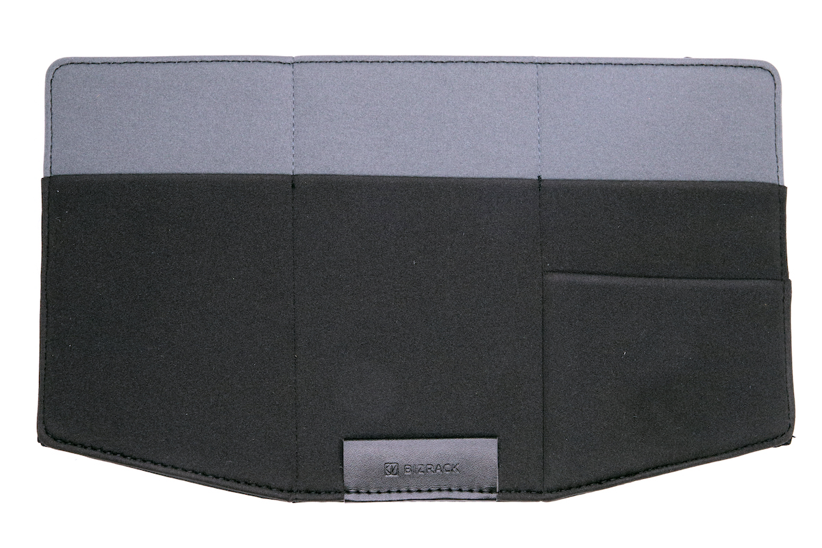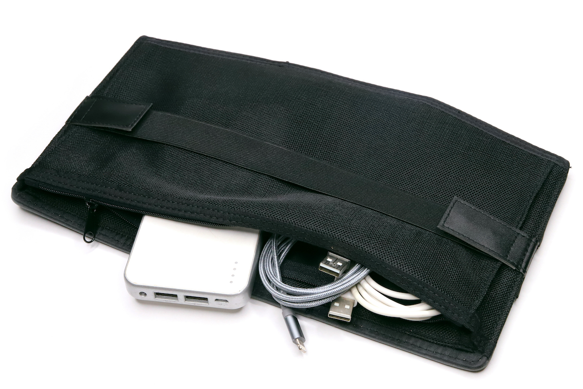 表側の素材はネオプレンで伸縮性のあるポケットが3列4個並び、裏側は全面メッシュポケットとゴムベルト、という構成。ポケットに必要なツールを入れた状態でゴムベルトをノートPCにかけてしまえば、一体化してまとめて持ち運べるのがメリットだ。オフィス内での移動はもとより、自宅内でだって、必要なものはまとまってくれていた方がありがたいのは、道理である。
