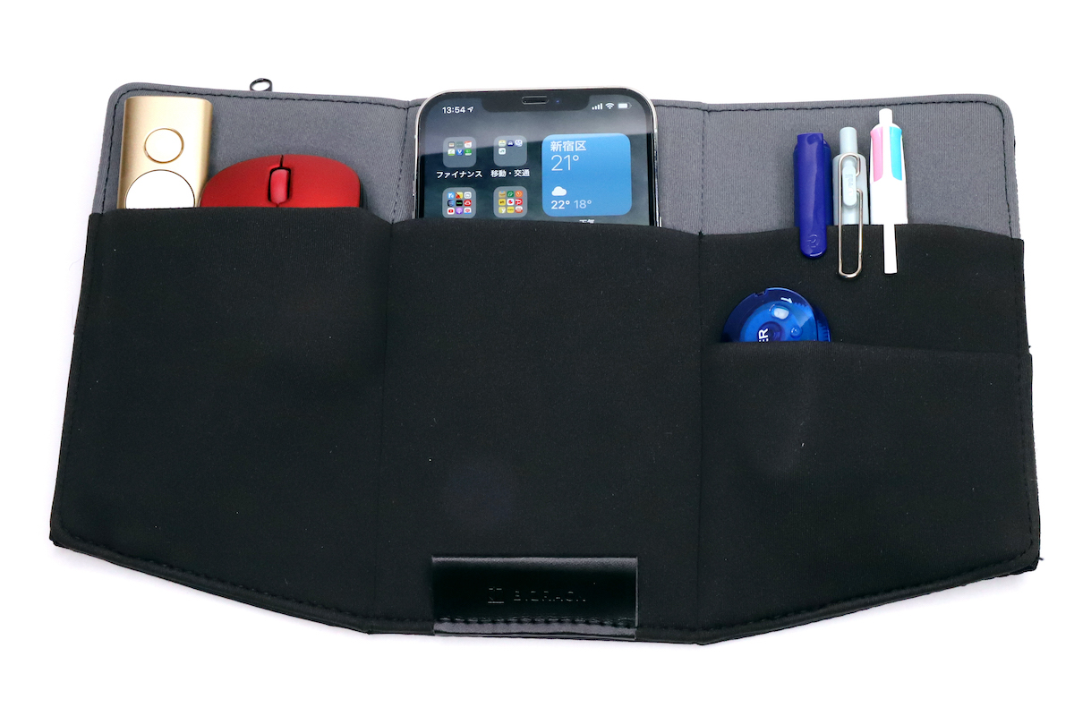 合わせてもう一つ紹介したいのが、同じくBIZRACKシリーズの「スタンド型ノートPCオーガナイザー <ビスラック>」。これはシンプルに、マウスや電源ケーブル、イヤホンといった、ノートPCと同時に使いたいガジェットを収納するポーチだ。