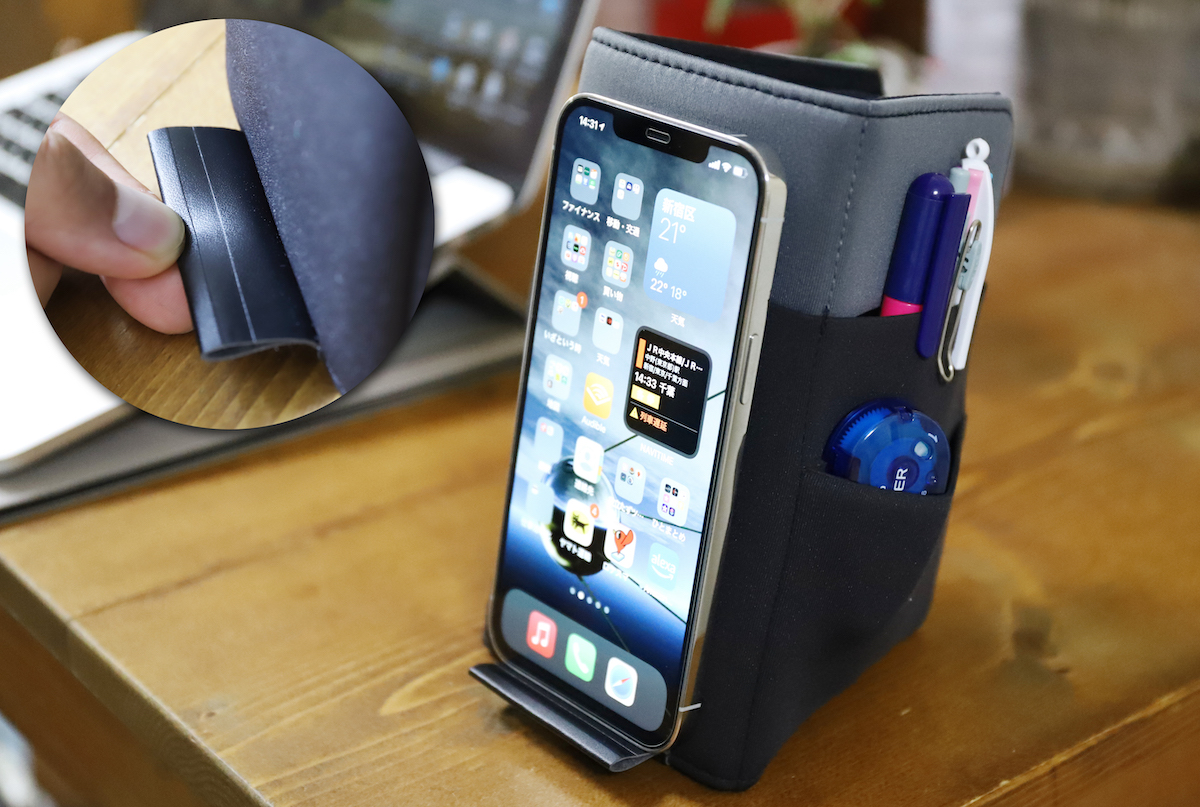 さらに、自立状態で下端のタブをめくってスマホを乗せると、スマホスタンドとしても機能する。自立した本体が傾いていることで、スマホ画面が見やすいようになっているのだ。