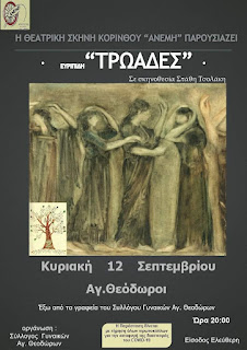 Την Κυριακή 12 Σεπτεμβρίου ο Σύλλογος γυναικών Αγίων Θεοδώρων διοργανώνει εκδήλωση στην οποία η Θεατρική Σκηνή Κορίνθου “Ανέμη” παρουσιάζει το έργο του Ευριπίδη “ΤΡΩΑΔΕΣ”.