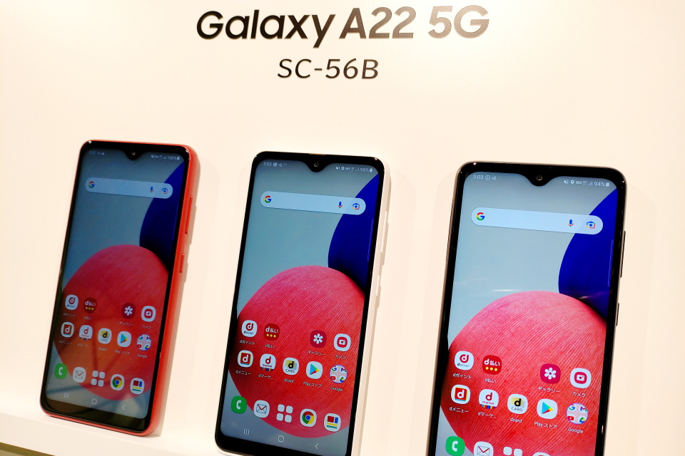 今回は記者説明会の後に開催されたメディア向けタッチ&トライ会場でGalaxy A22 5G SC-56Bの実機を試すことができたので、写真や動画を交えながらレポートする。