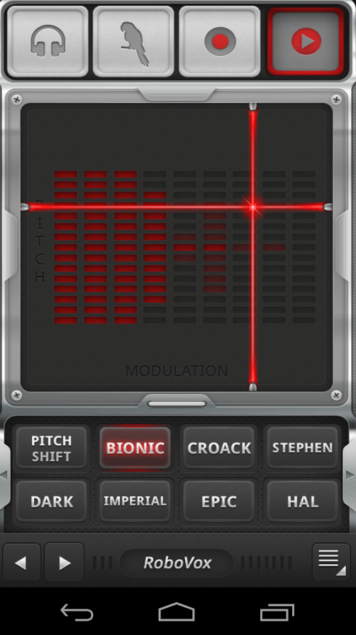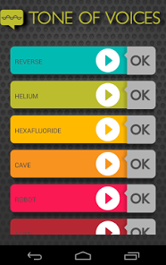 plikasi ini agak unik karena ini memberi Anda sedikit kebebasan dalam mengubah suara Anda, tetapi memiliki keterbatasan lain pada waktu yang sama. Aplikasi ini memiliki preset efek suara seperti kucing, robot, megafon dan lebih tetapi terutama memberikan Anda kebebasan untuk merekam suara Anda dan mengubah pitch itu, kecepatan, jumlah logam, jumlah amplifikasi, paduan suara efek dan echo. Anda dapat kemudian berbagi suara Anda dibuat melalui aplikasi chatting atau mengaturnya sebagai nada dering. Dalam antarmuka pengguna grafis, itu juga menunjukkan volume dalam skala VU. Di tangan benar dan untuk tujuan yang benar, aplikasi ini dapat menjadi sangat efektif dalam melakukan apa yang dilakukannya.