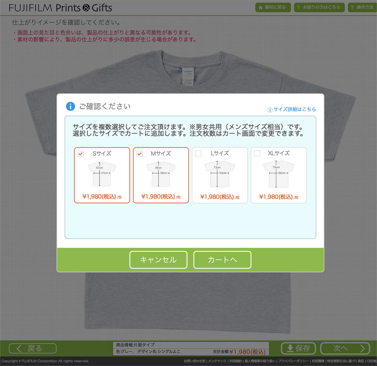 FUJIFILM Prints&Giftsで会員登録してTシャツの注文画面へ。まずTシャツのカラーを選択します。どのカラーも価格は一緒です。