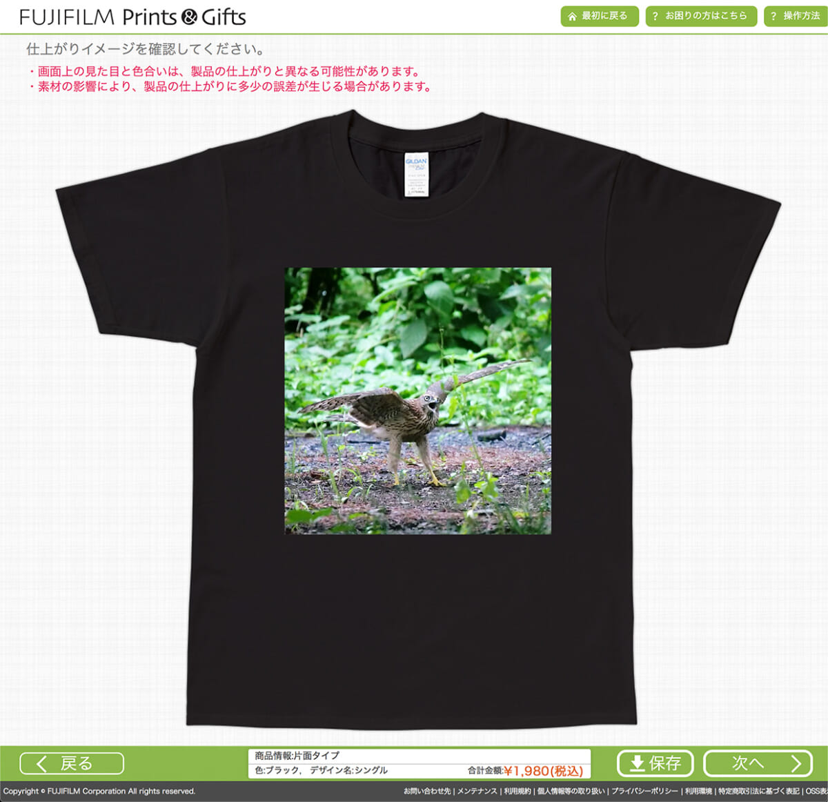FUJIFILM Prints&Giftsなら、アプリなどを使わずWebサイトにアクセスするだけで、デザイン選択、画像データのアップロード、編集、Tシャツのサイズ選択、注文、決済まで完了します。これならはじめての注文でも迷わず、失敗する心配もありません。価格は1枚1980円で、送料は宅配便なら全国一律610円、写真店かセブンイレブン受け取りなら送料は不要、納期は約2週間です。