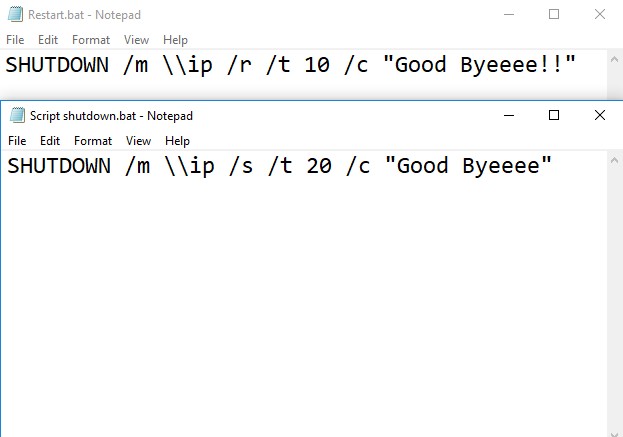 SHUTDOWN /m \\IP Address /r /t 10 /c “Good Byeeee!!”