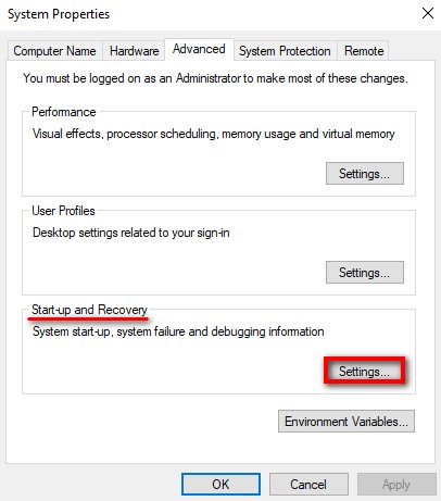 4. จากนั้นให้มองหาในส่วนของ Startup and Recovery และให้คลิกที่ปุ่ม Settings ที่อยู่ในส่วนนี้