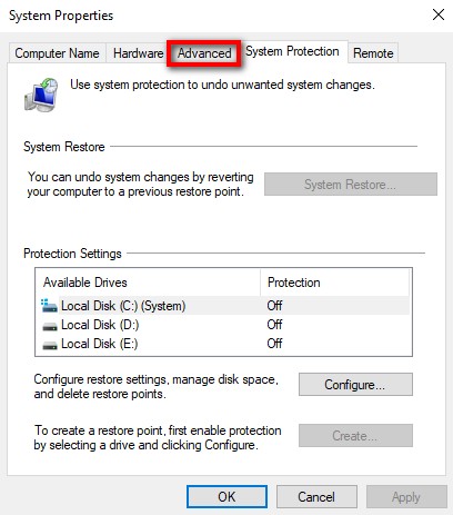 3. รอสักครู่จะมีหน้าจอ System Properties ขึ้นมา ให้ไปคลิกเลือกที่แท๊บ Advanced