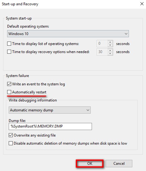 7. จากนั้นให้กดปุ่ม OK > OK เป็นอันว่าเราได้ตั้งค่าเรียบร้อยแล้ว ครั้งต่อไปเมื่อเกิด Blue Screen เครื่องคอมพิวเตอร์ของเรา ก็จะไม่ทำการ Restart ตัวเองอีกต่อไปแล้วครับ