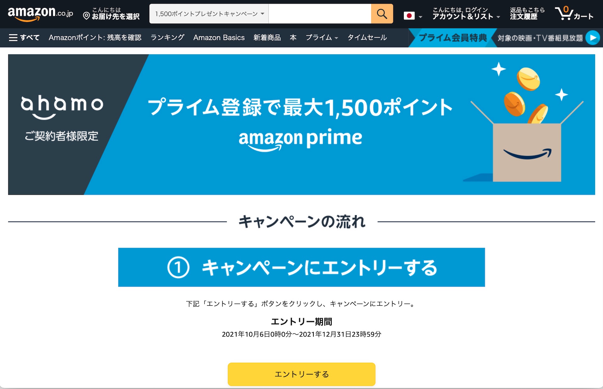 キャンペーンに参加するには上記のキャンペーンWebページにて2021年10月6日(水)0:00~12月31日(禽)23:59の期間中にエントリーが必要で、エントリーしてから72時間以内にAmazonプライム会員に登録し、その後、ポイント付与期間(エントリーした日付の暦月から4か月間)までAmazonプライム会員であり続ける必要があります。