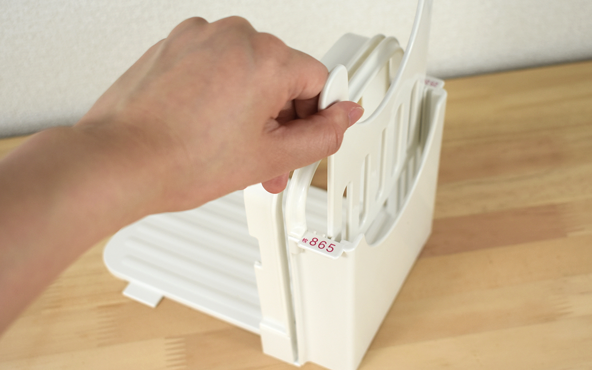 パっと見の印象は迫力を感じますが、使い方は至ってシンプル。本体にセットされている「厚み調整プレート」を好みの厚さに合わせて、5枚切(25mm)・6枚切(20mm)・8枚切(15mm)・12枚切(10mm)の溝に差し込めば準備完了です。