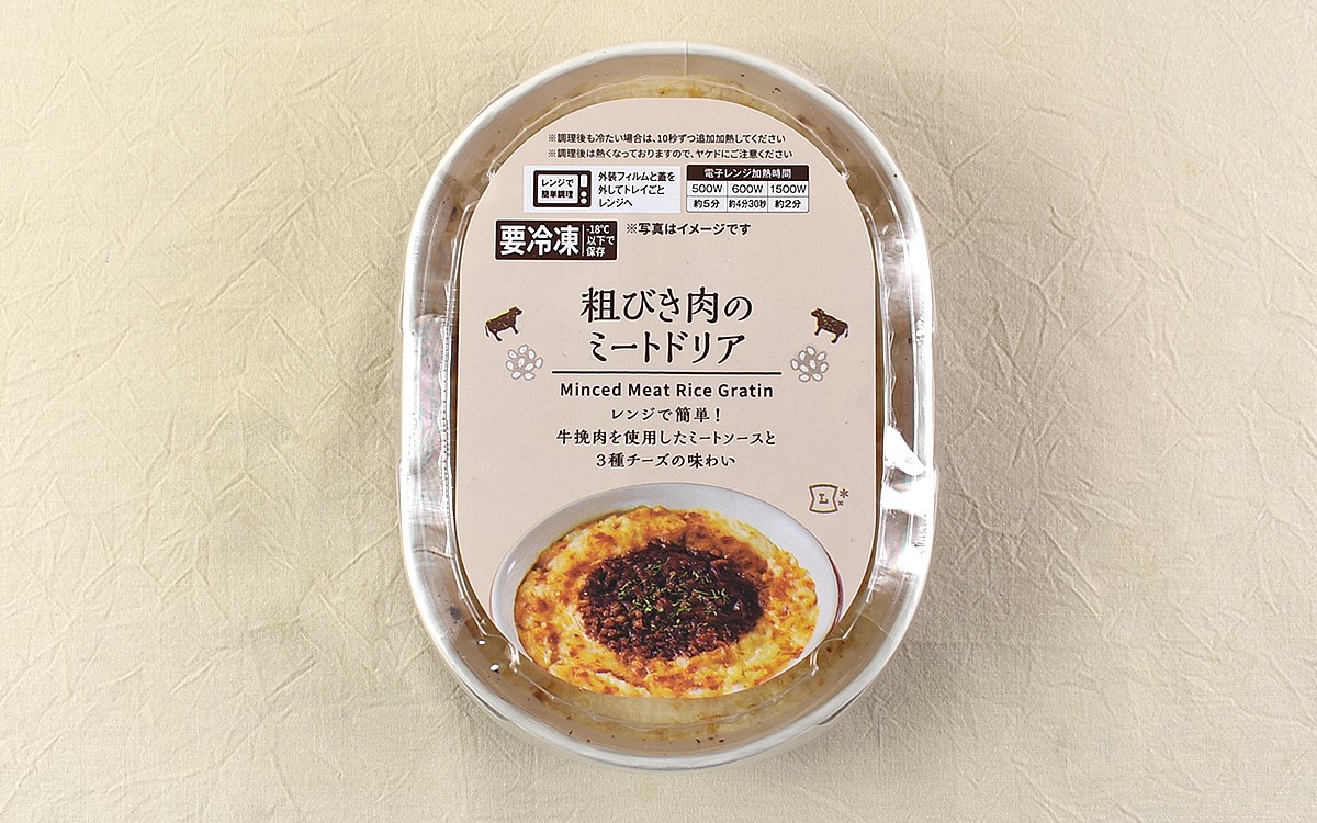 紙の容器に入った「粗びき肉のミートドリア」は冷凍食品タイプなので、長く保存できるのもポイント。ちなみに今回購入した商品の場合、来年の8月末まで保管可能です。