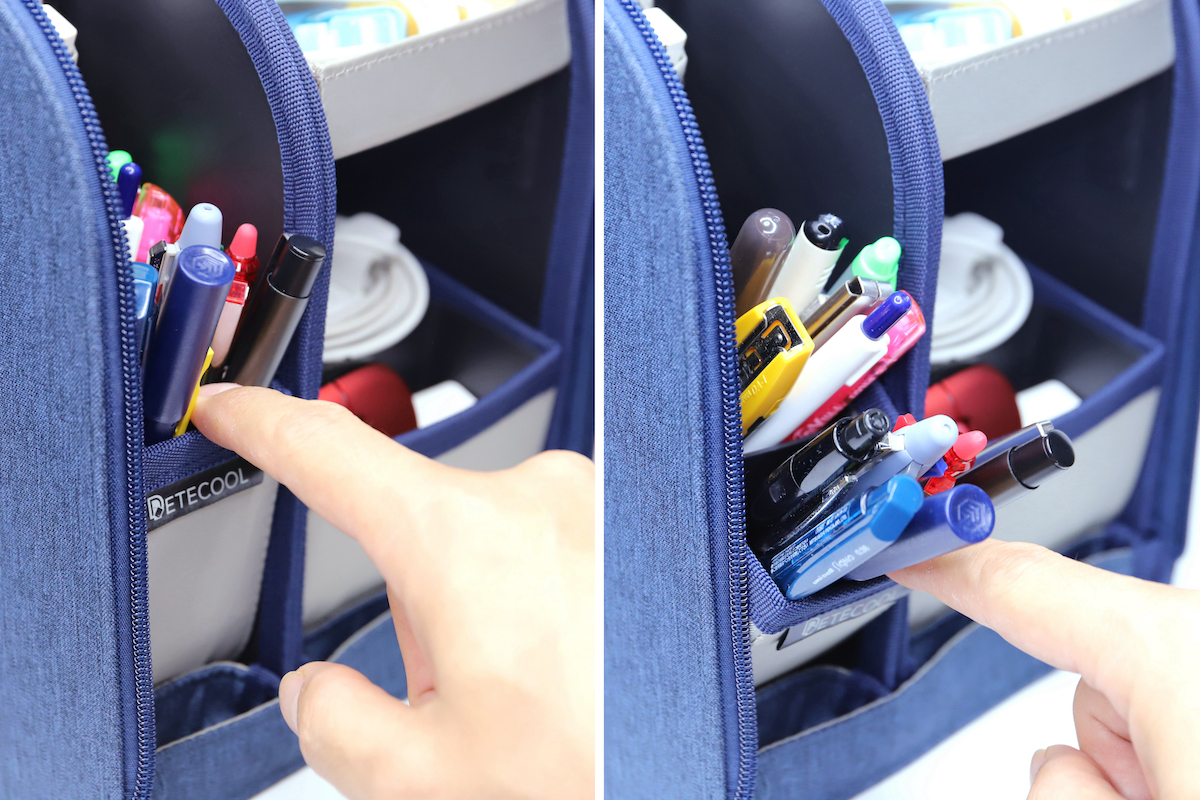 ところが、傾ければ全体が見渡しやすくなるため、閲覧性が高まるというのもメリットだ。視線が行き渡らなければ、単に収納したまま死蔵するペンやツールが増えるだけ。大容量ペンケースには、この“閲覧性の高さ”が絶対に必要なのである。