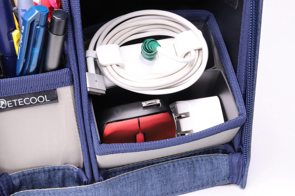 また、ペンケースユニット上段はポケットになっている。消しゴムやテープのりなど、こちらも同様に、バスケットに入れてしまうと沈んでしまう小物を収納するのにちょうどいい。