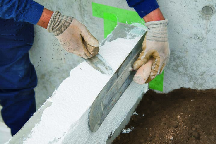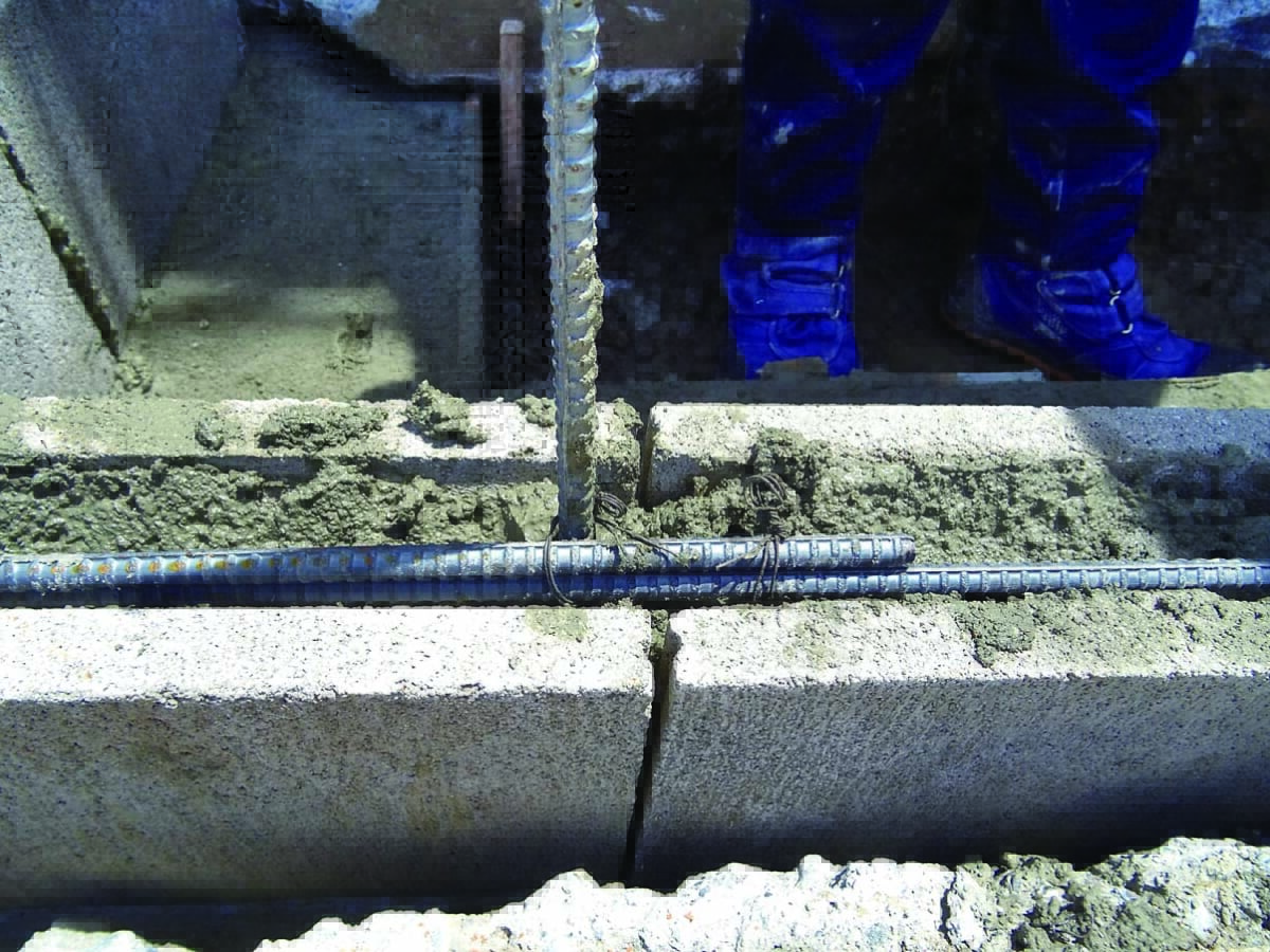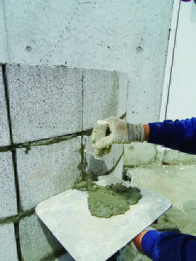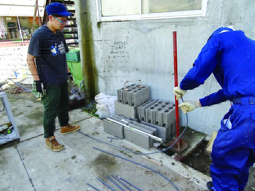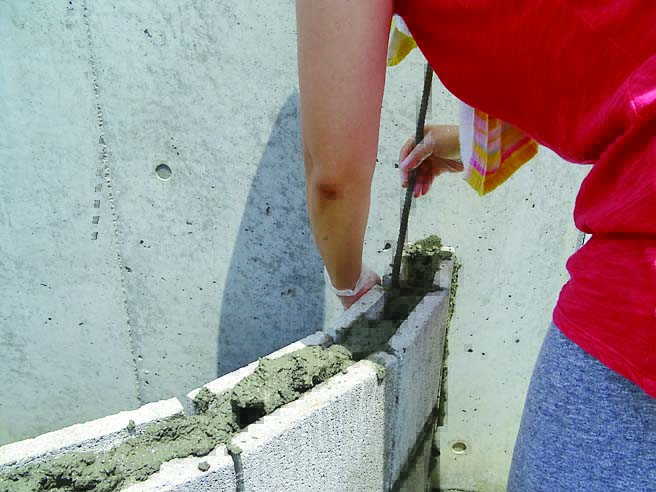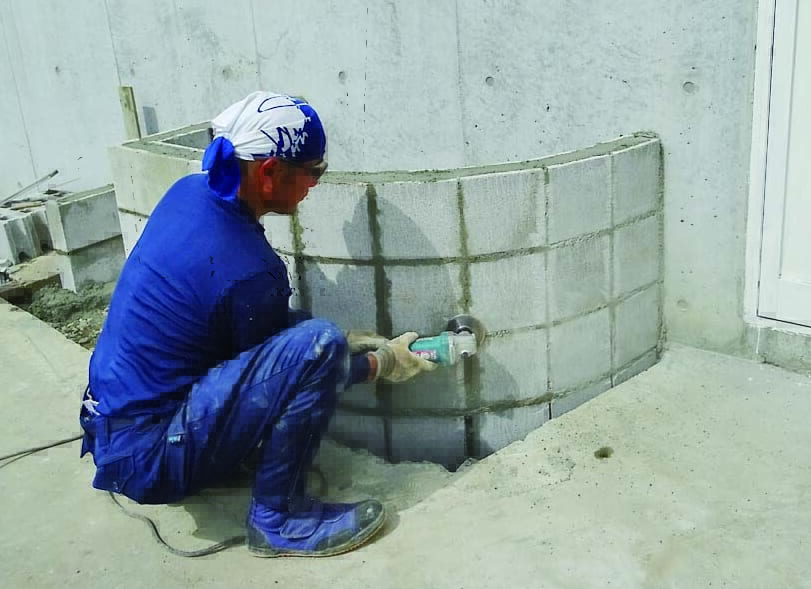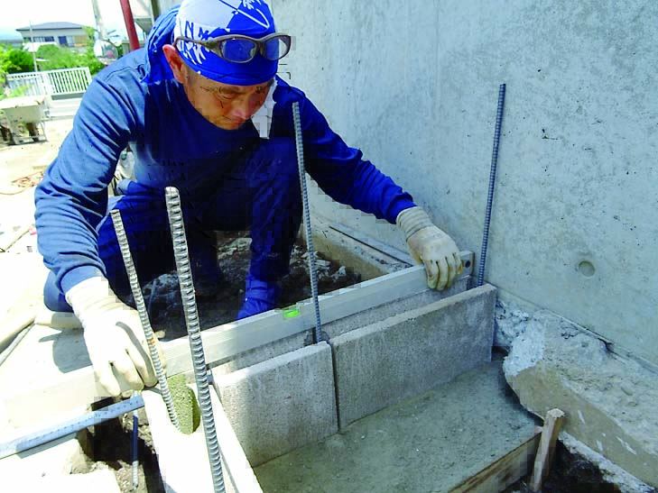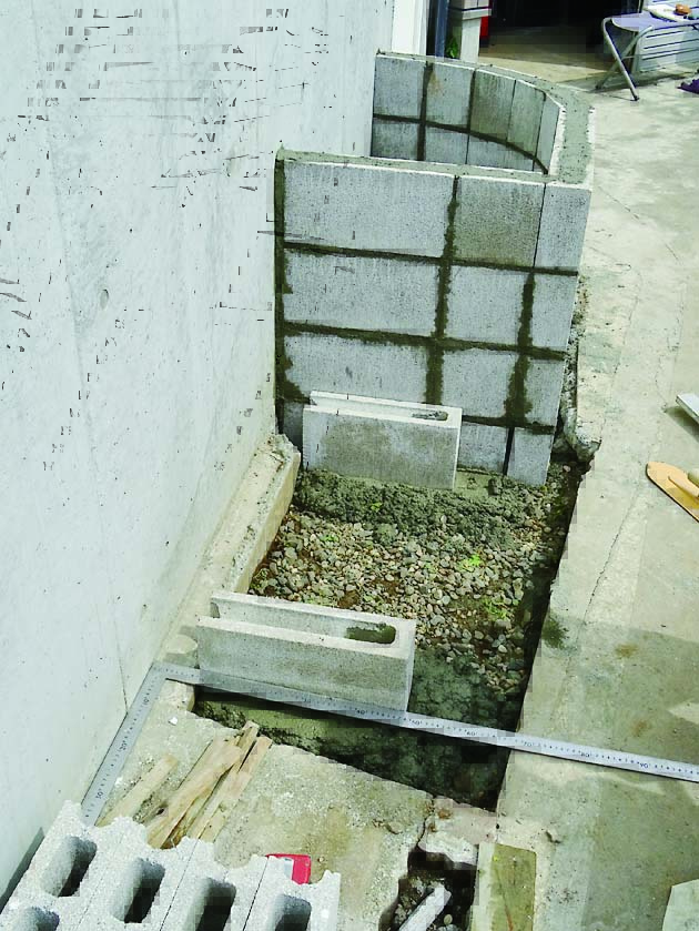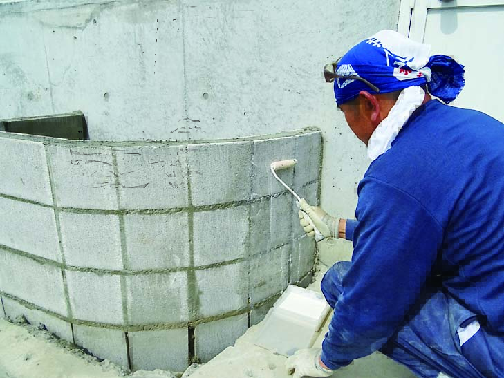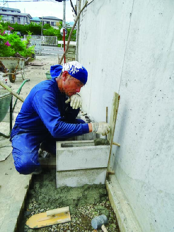 基礎は土圧に耐えられるようにL字に曲げた鉄筋を使用するL形基礎(レイズドベッド基礎構造図参照)にした。頑丈な作りにするため、軽量ブロックには縦筋と横筋を入れている。コンクリートブロック仕上げのままだと武骨さが残るため、漆喰とタイルで化粧することにした。漆喰は白、タイルは涼やかな印象になるように青系のものを選んだ。