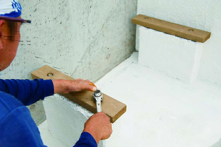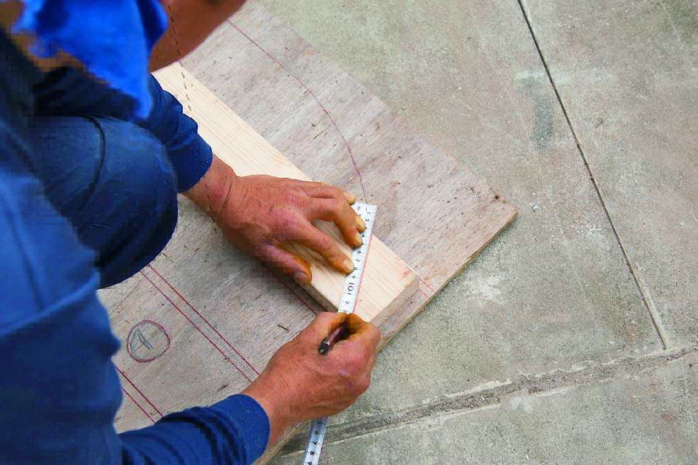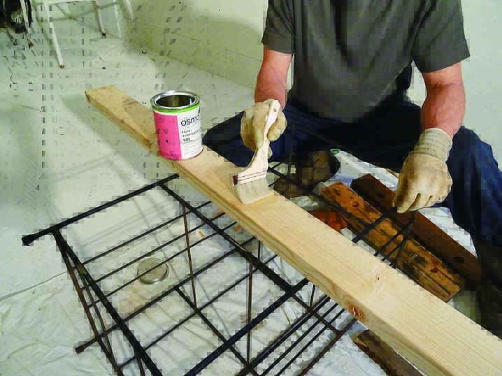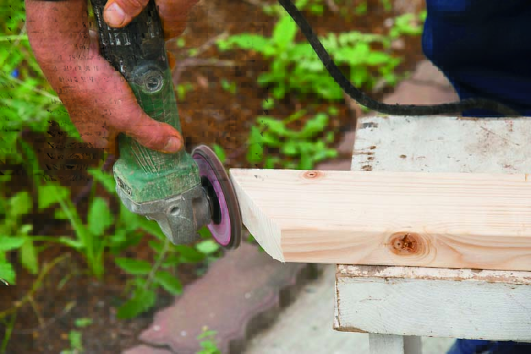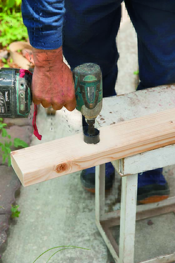 また、ガーデニングの合間にひと息ついたり、道具置き場に活用できるベンチをつけている。ベンチは脚を軽量ブロックで製作。高さ400mm程度になるように2段積む。しっかりした作りにするため縦筋を入れている。レイズドベッドと同様に漆喰で仕上げた。ベンチの座板には2×4材を使用し、道具掛けとして木の枝を取り付けている。
