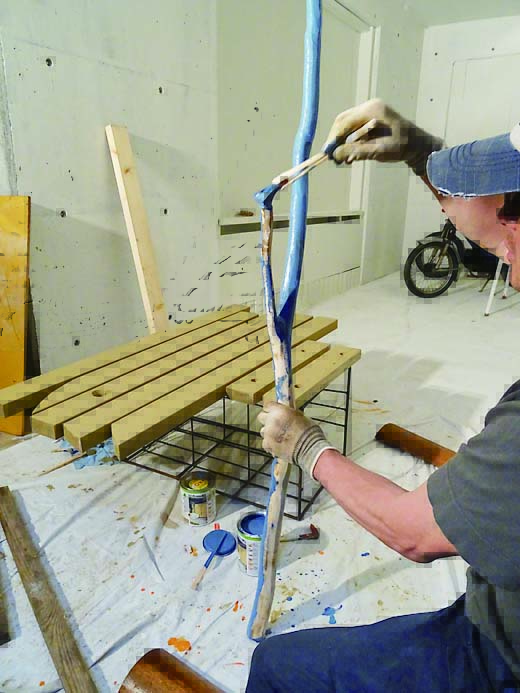 塗料(オスモカラー カントリーカラー0.75L缶/グレイブラウン、ダブブルー)、六角ボルトナット(2本)、ゴムシート(2×100×100mm)、特厚金折45mm、コーススレッド(65mm)、スリムビス(40mm)、コンクリートアンカー(スピットアンカー/下穴径6mm)、木の枝(高さ約1800mm)