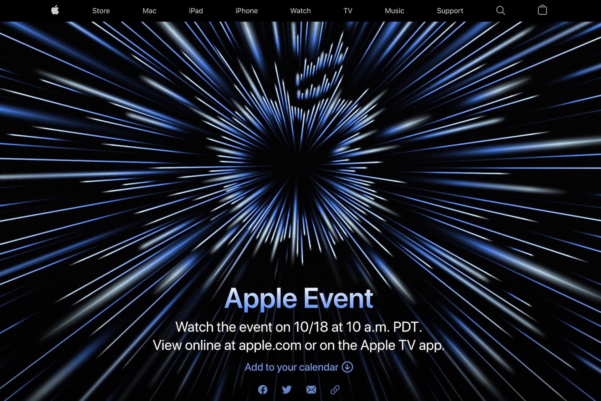 Appleは12日(現地時間)、同社の公式Webサイトにて発表会「Apple Event」( https://www.apple.com/apple-events/ )を現地時間(PDT)の2021年10月18日(月)10:00から開催すると案内しています。日本時間(JST)では10月19日(火)2:00から。