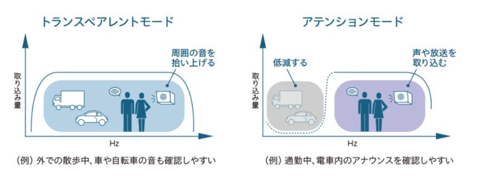 また、イヤホンをつけたまま周囲の音を聴ける「アンビエントモード」も利用可能。周囲の音をそのまま取り込むトランスペアレントモードと、ノイズを低減して人の声だけを強調するアテンションモードの切り替えも可能です。