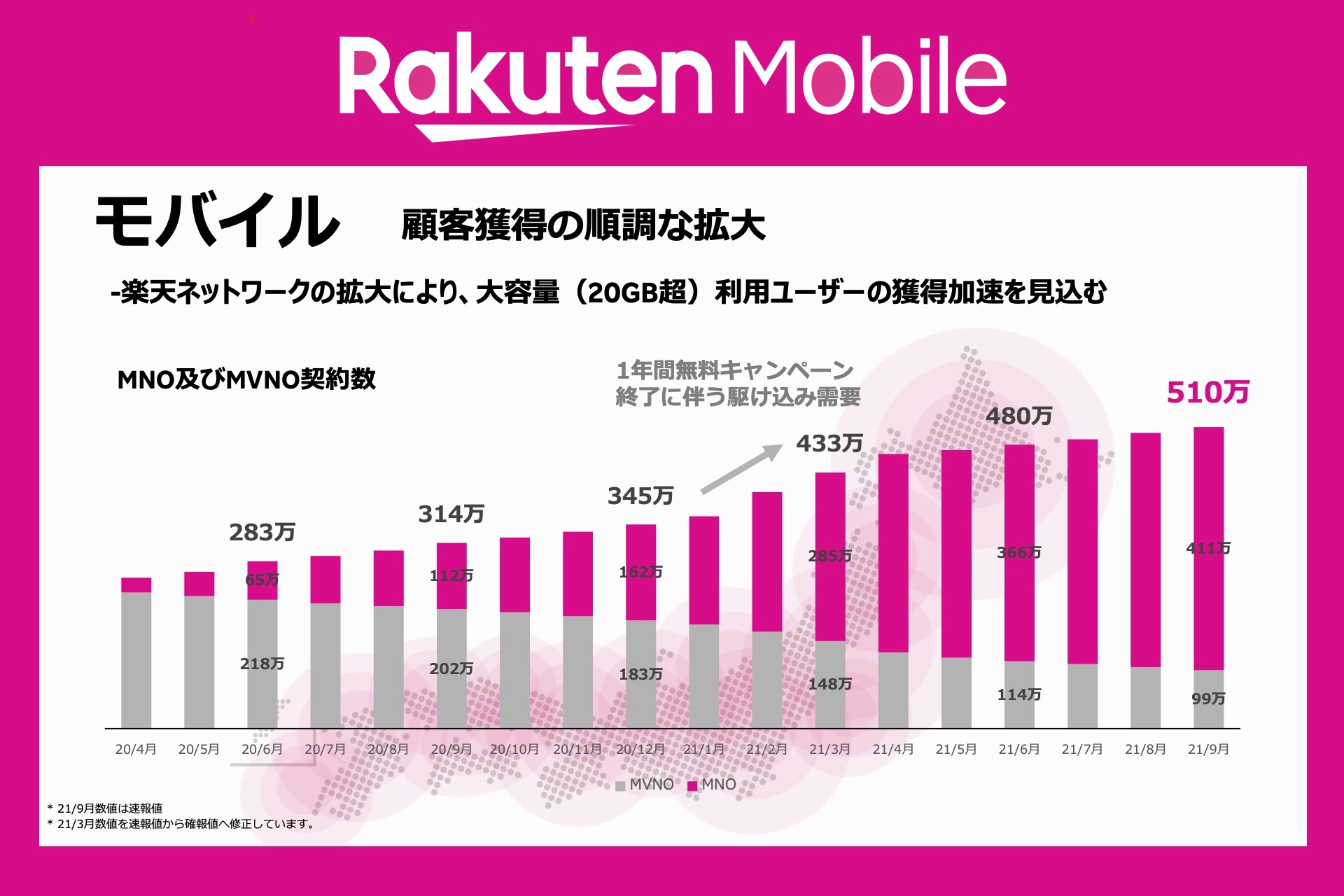 中でも今年4月に提供を開始した料金プラン「Rakuten UN-LIMIT VI」( https://network.mobile.rakuten.co.jp/ )によって高い競争力となり、総務省による調査では最も選ばれた料金プランであることが明らかになり、MNO契約数が2021年9月末時点で411万に達し、仮想移動体通信事業者(MVNO)との合計では510万となったということです。