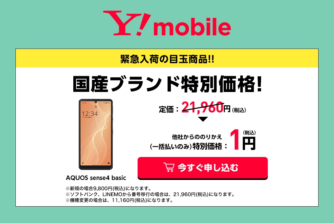 | Y!mobileスマホ「SHARP AQUOS sense4 basic A003SH」の割引額は増額! |