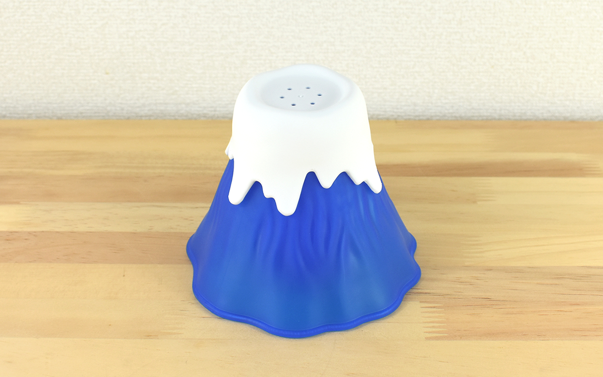 サイズは約14(幅)×11.5cm(高さ)。雪を被ったような白いふたが外せるようになっていて、中はコップ状にぽっかりと口が開いています。必要になるのは水(約100cc)と酢(約70cc)。パっと計量できなくても側面に「WATER」と「VINEGAR」の刻印があるので、それぞれの目安にしてください。