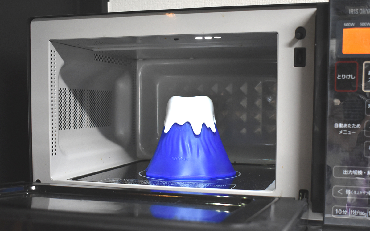 ふたを戻して電子レンジ(500W)で約5~8分間加熱すると、小さな穴の開いた頂部から火山のようにモクモクと蒸気が…。加熱後に約2~3分蒸らしたら、あとはふきんで汚れを拭うだけ。庫内に酢の成分を含んだ水滴が付着しているため、水拭きよりも汚れが落ちやすく感じました。