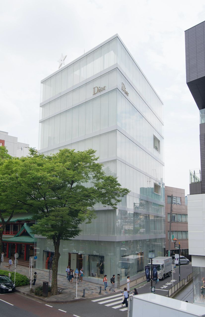 純白のドレスをまとった淑女が如く、表参道に凛と立つ《Dior表参道》。設計は妹島和世と西沢立衛の建築家ユニットSANNA。この建築の最大の魅力は、なんと言ってもその透明感のある、白く柔和な外観である。