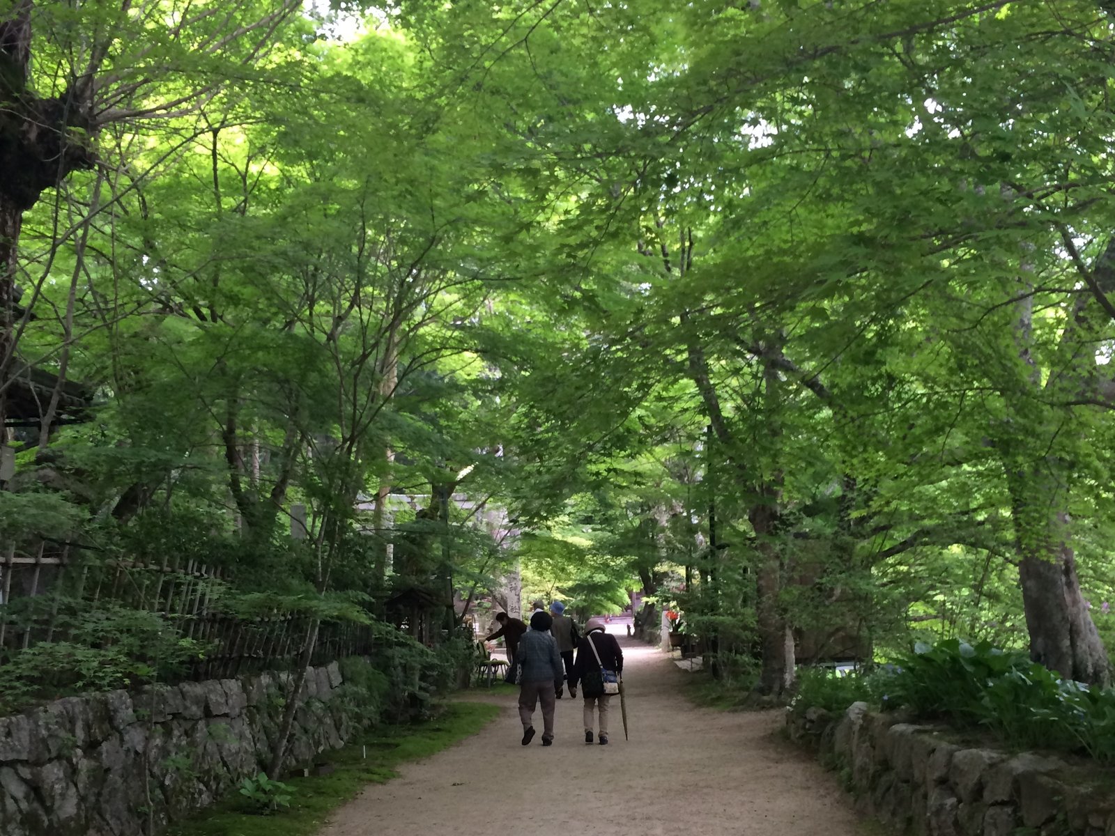 雨がポツリポツリと降りかけましたが、傘もささずに新緑の木々に囲まれた参道を本堂に向かって歩きました。