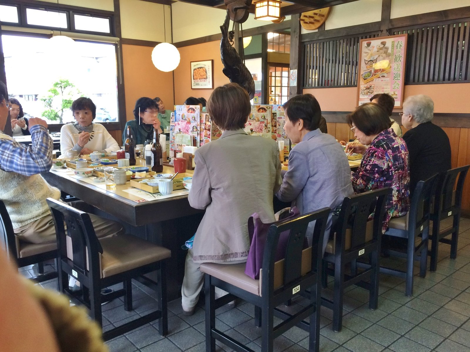 雨も変わらずポツリポツリと降り始め、11時半過ぎに長寿寺を出発し昼食会場へ向かいました。1号線沿いの食事処サガミで、わいわいがやがや語らいながらの楽しい昼食を頂きました。