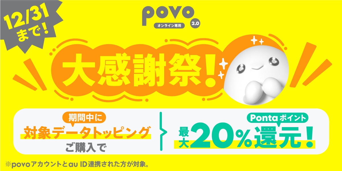 KDDIと沖縄セルラー電話は16日、オンライン専用の料金プランとして提供している携帯電話サービス「povo2.0」( https://povo.jp/ )において20GBまたは60GB、150GBのデータトッピングを申し込んだ場合に10%または20%のPontaポイントを還元する「povo2.0 大感謝祭!」を2021年12月16日(木)0:00から2021年12月31日(金)23:59まで実施するとお知らせしています。