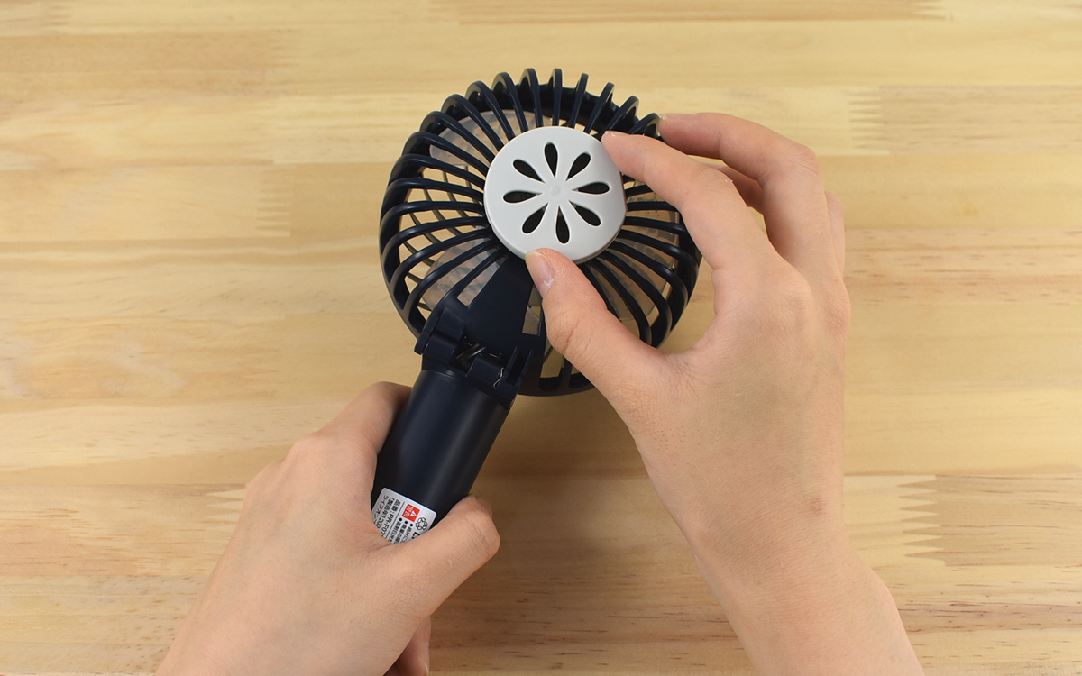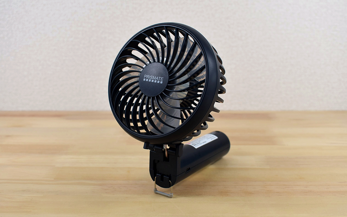また、ファン部分を折り曲げて“折りたたみ収納式スタンド”をセットすれば、自立式のファンに早変わり。実際に机に置いてみたところ、ハンズフリーで快適に風を浴びることができました。これならデスクワークなど、様々なシーンで活躍してくれそうですね。
