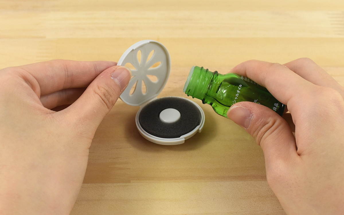 付属のアロマトレーを使用し、アロマオイルの香りを楽しめるのも大きな特徴。アロマオイルを垂らして本体の背面にセットすることで、お好みの香りが風に乗ってふわっと広がります。