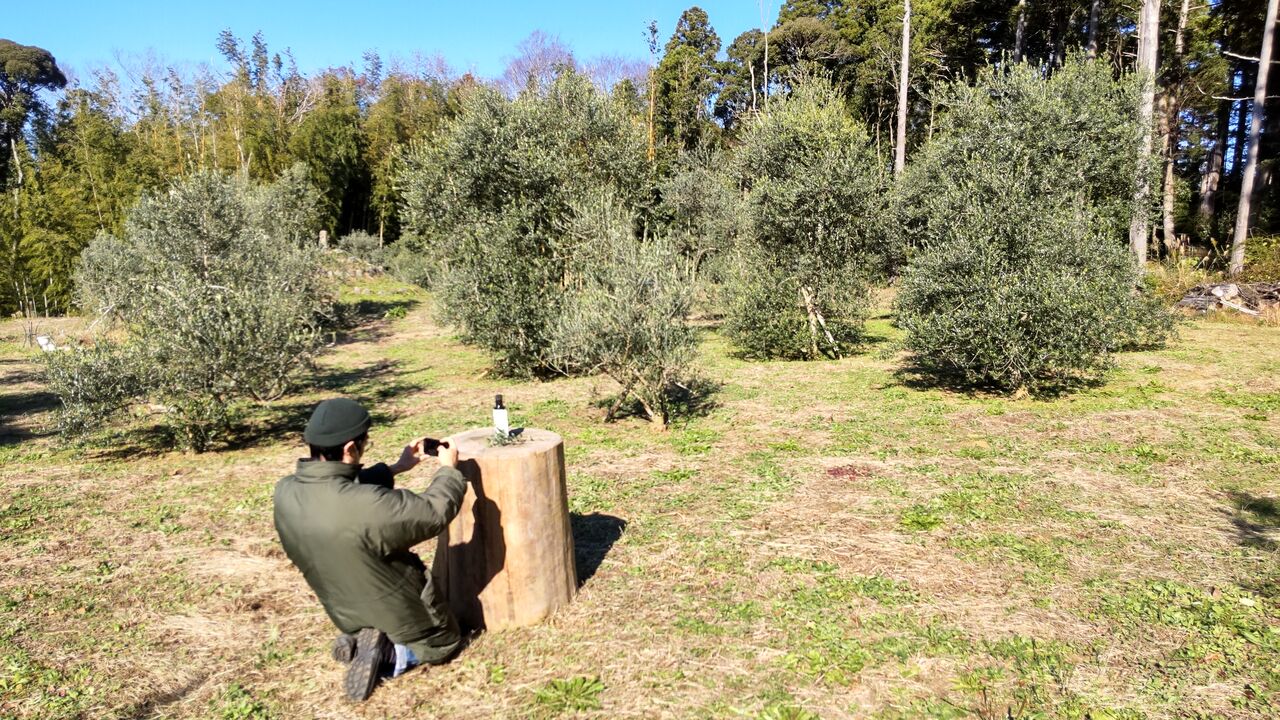 その商品が到着し、写真撮影するそうで、庭の木の切り株を運んでオリーブ畑で撮影する事になりました。