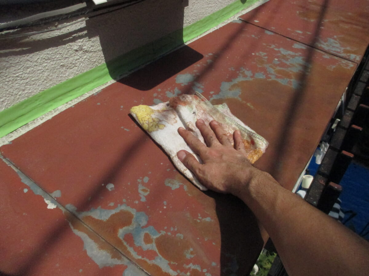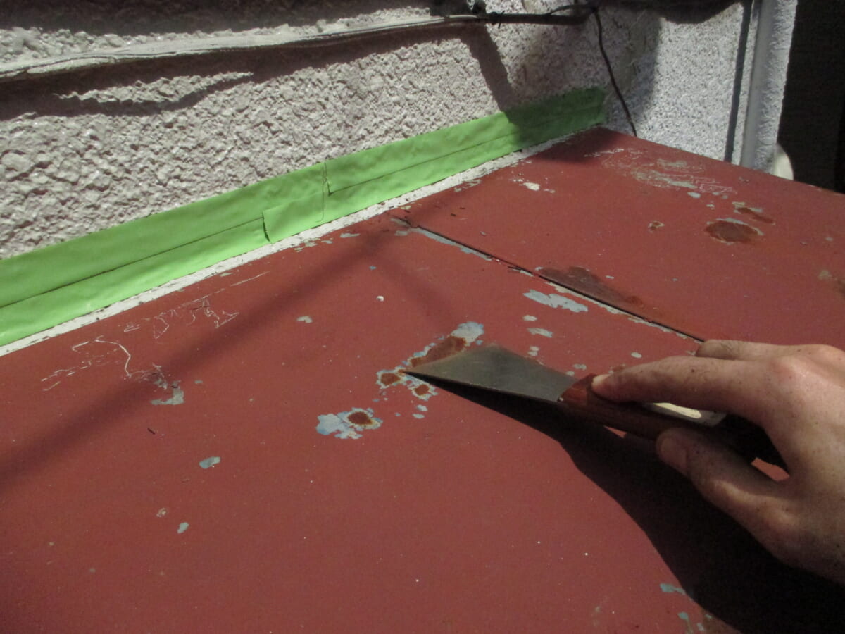 古い塗装やサビを落とすには、スクレーパー、真ちゅうブラシ、電動サンダーなどの道具を使う。広い部分は電動サンダーやスクレーパー。狭い部分には真ちゅうブラシが使いやすい。削ったり、研磨する作業が済んだら、ウエスできれいにぬぐっておく。