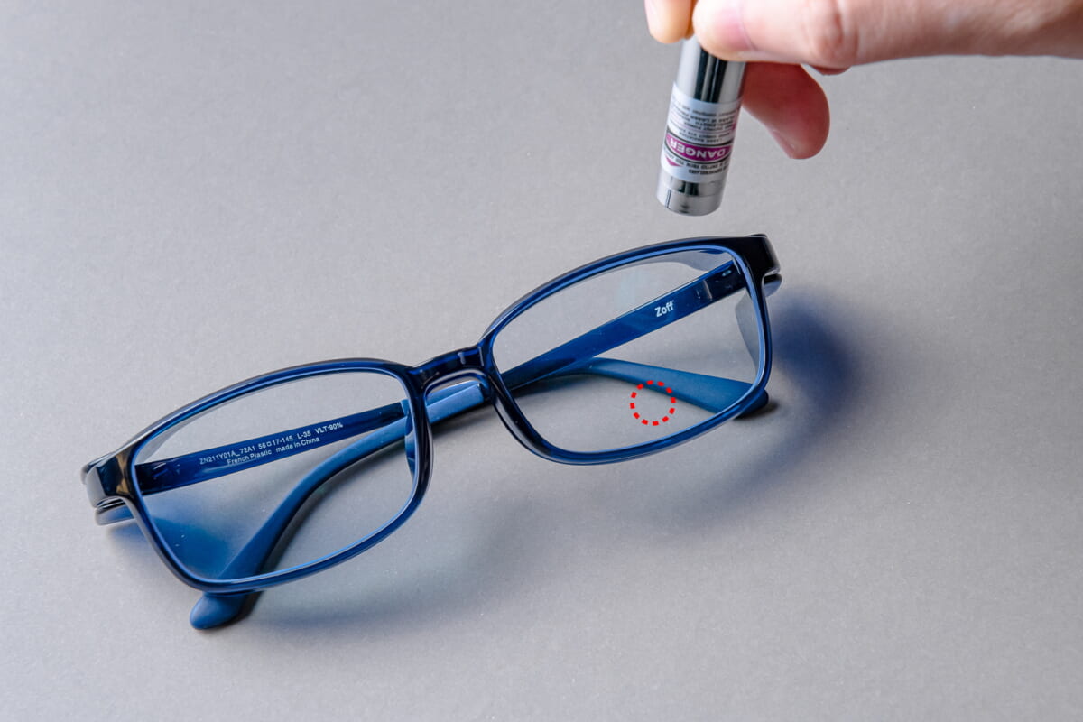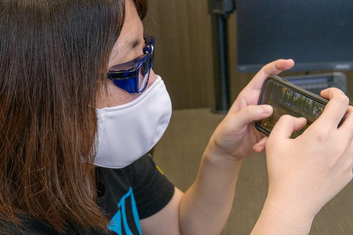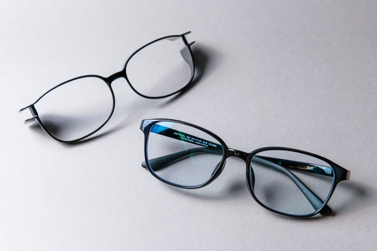 まずは製品の説明から。Zoff GAMEは、最もまぶしく感じる黄色系の光を効果的にカットしつつ、明るさを保ちながらまぶしさを和らげる「イエローカットレンズ(度なし)」を搭載したメガネ。レンズは薄いブルー系の色で、ゲーム画面も違和感なく、自然な見た目を確保できます。