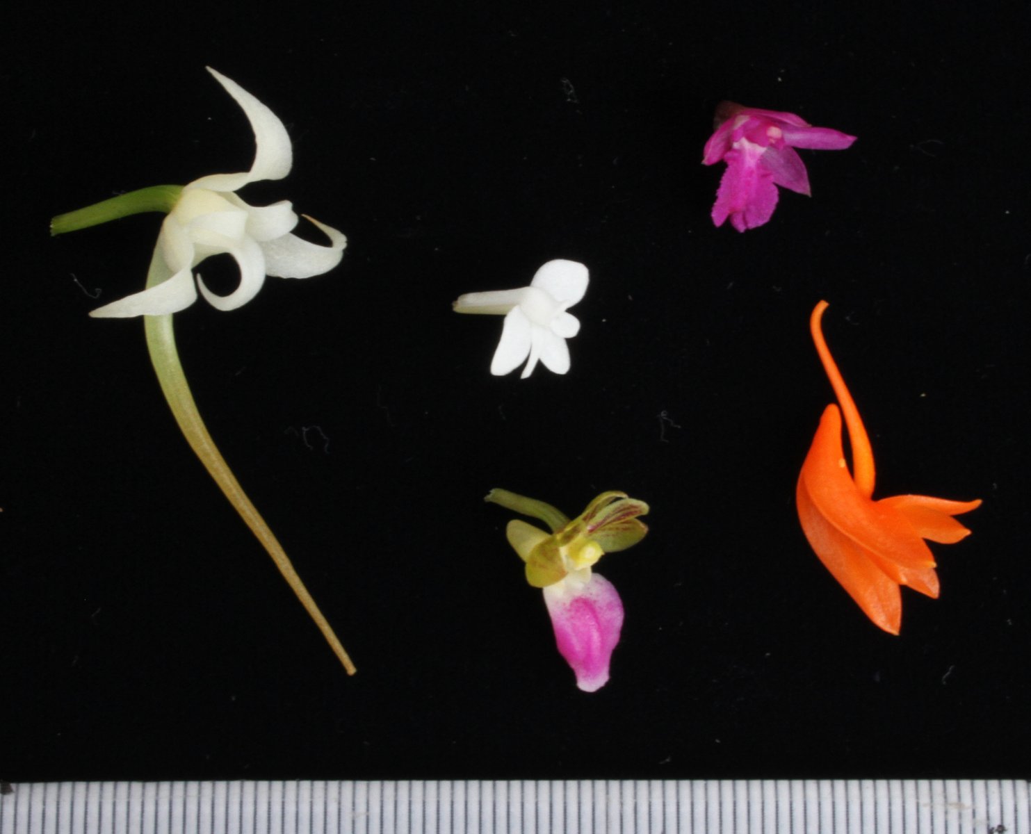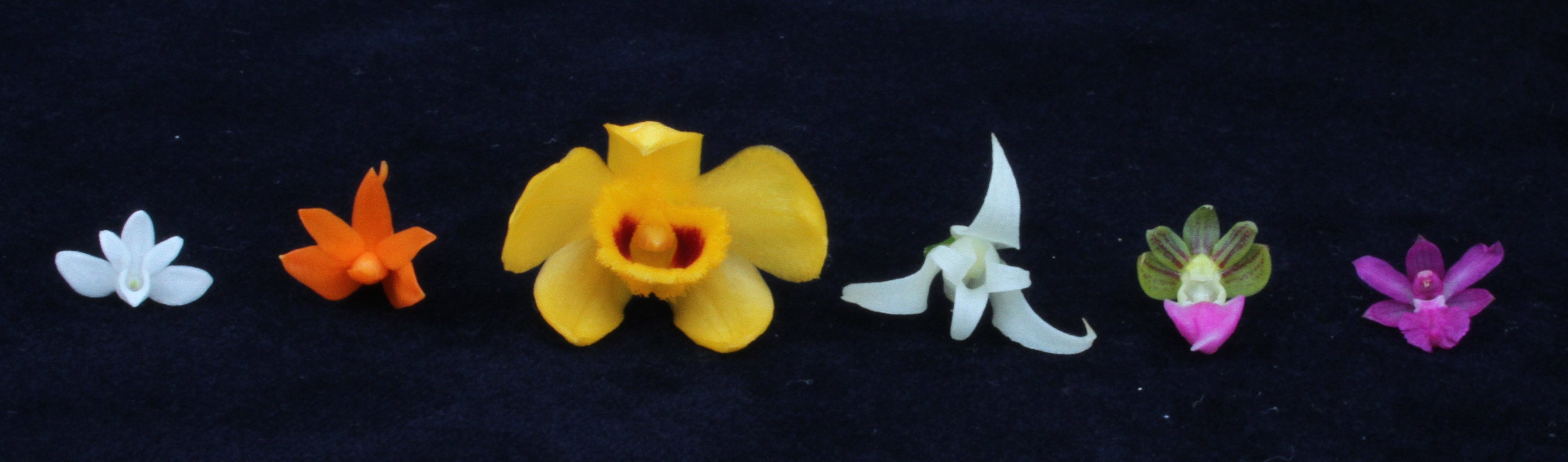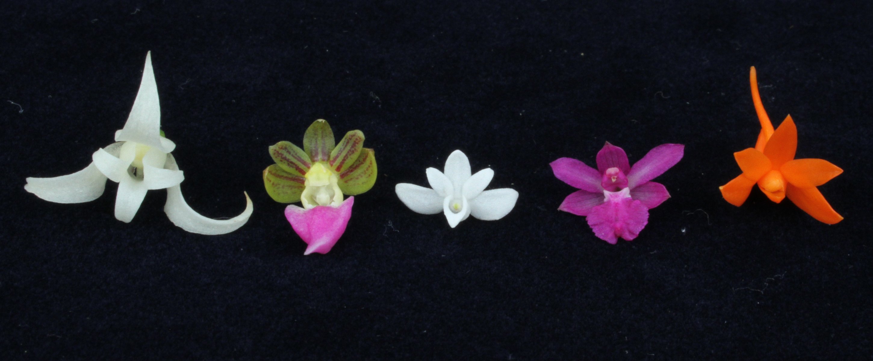 花径1cm程度の小さい花がたまたままとまって咲いていましたので、集めて撮りました。 それぞれの属種名です。 左から、Angraecum distichum, Den. fulgidum, Den. chrysanthum, Cyrtorchis acuminata, Pelatantheria insectifera, Isabelia pulchella 全て原種でした。
