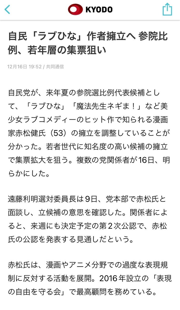 自民党「ラブひな」作者擁立へ。赤松 健先生のネームバリューで参院比例、若年層の集票狙いか