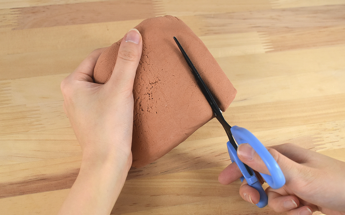 指で簡単に変形するほど柔らかいねんどですが、ハサミで切り分けてもOK。なお乾燥前ならねんど同士くっつきやすく、余っても塊にすぐ戻すことができます。