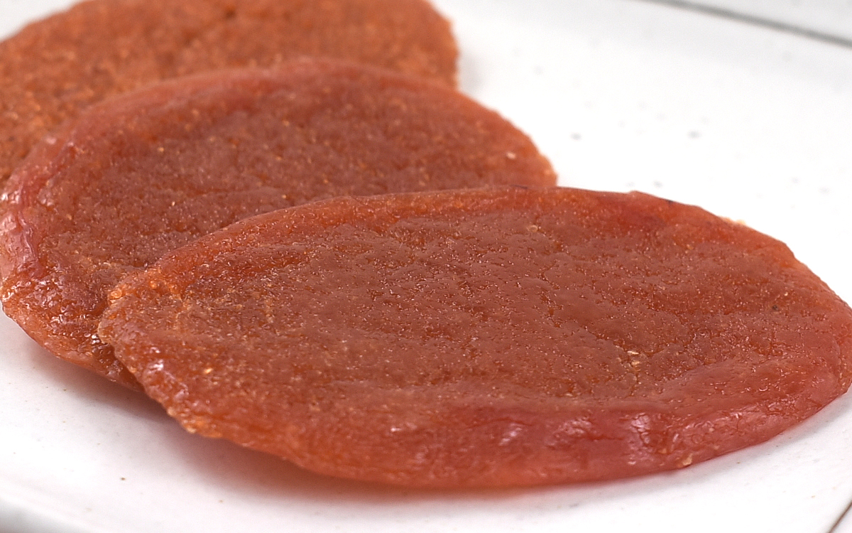 真空個包装で届く同商品。従来の明太子とは色・かたちともに大きく異なり、そのビジュアルはジャーキーのように見えるかも。パッケージ封入時はわらじ型をしていますが、「濃厚な味ですので、なるべく小さめにカットして少しずつお召し上がりください」との説明書きも添えられていました。