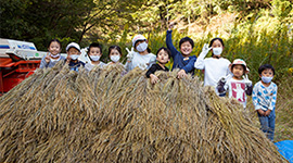 緊急事態宣言が解除となり、初の従業員ボランティアによる活動を実施! 9月に稲刈りをし「はさ掛け」で自然乾燥させていた稲を親子で脱穀しました♪