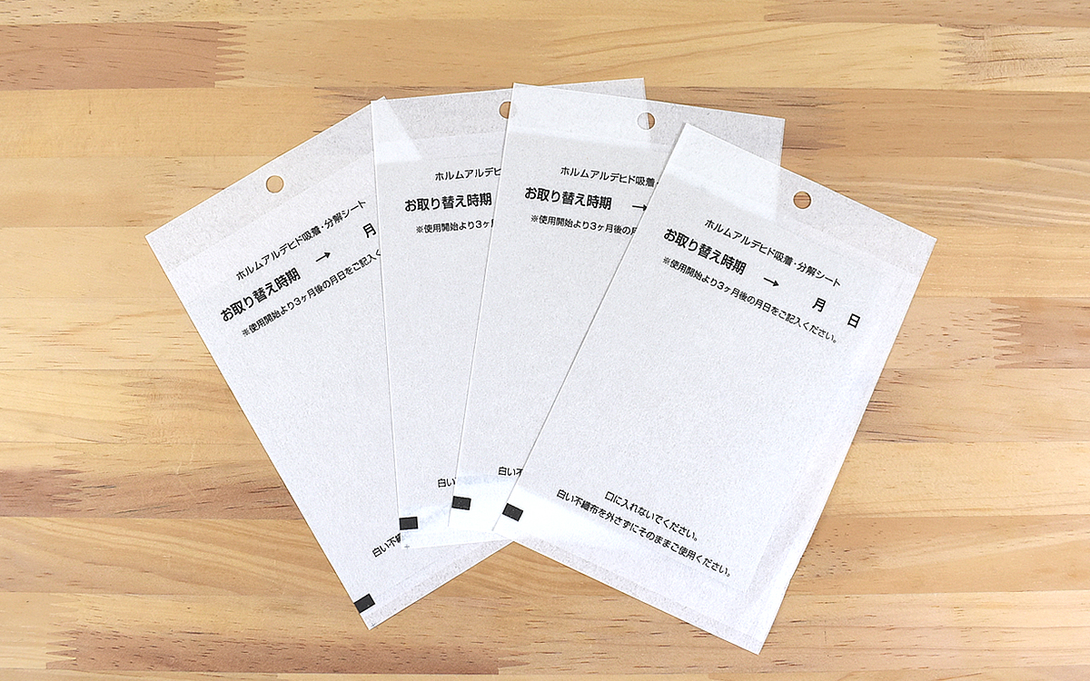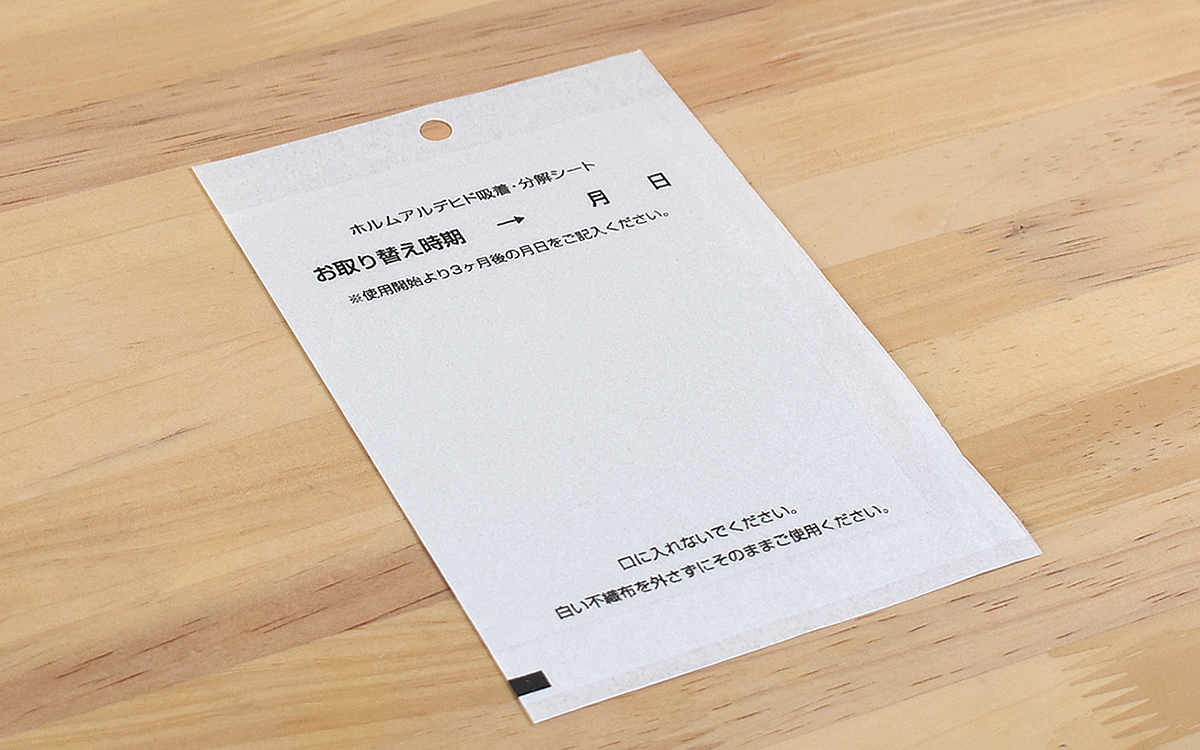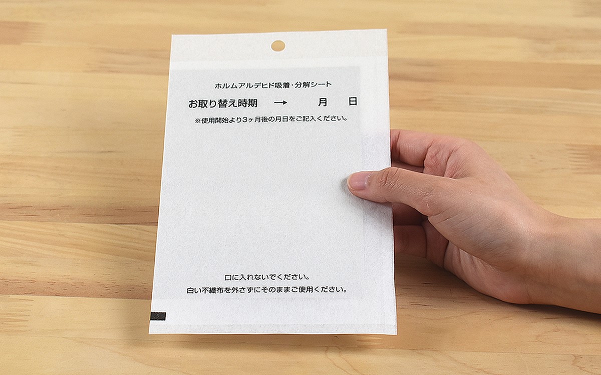 実際に使用する際は、不織布にシートを入れたままタンス・食器棚・げた箱などの収納部に設置するだけ。厚みがほとんどないのでジャマにならず、平置きできなければヒモやフックに吊るして使うこともできます。ちなみにホルムアルデヒドは長期間放出されることもあり、説明書には“継続的な使用”が勧められていました。