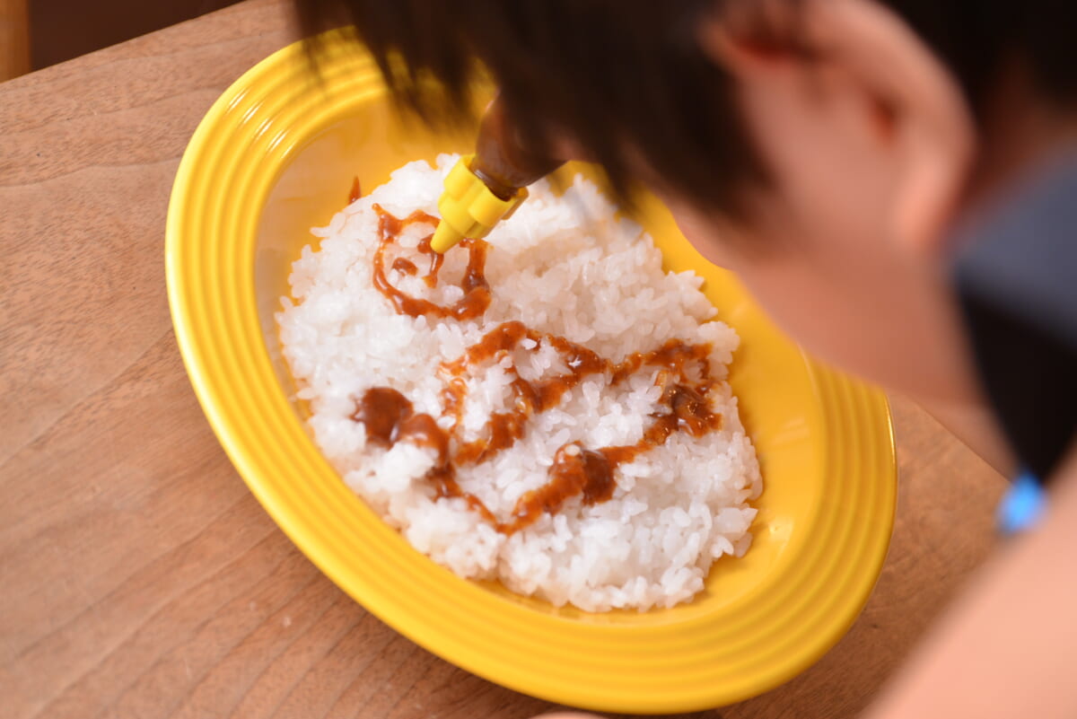 商品のインプレッションは、筆者のほうも子どもにお願いすることに。まずはご飯の上に書いてもらいました。固すぎずやわらかすぎず、スマートに描けたようで満足気です。