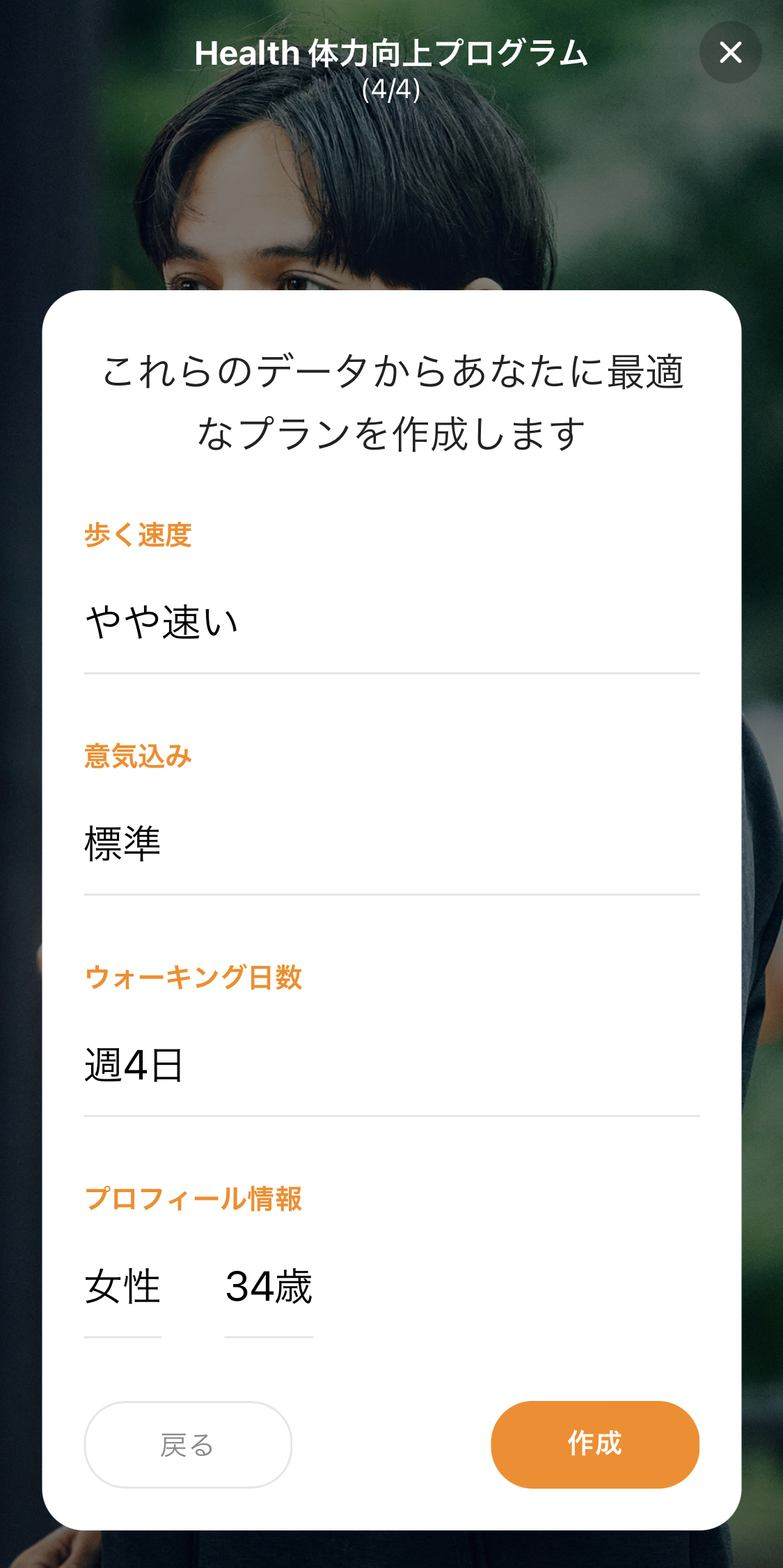 さらに、「あなたの歩く速度は同年代に比べて速いほうですか?」「意気込みを教えてください」「1週間に何日ウォーキングを頑張れますか?」という、3つの質問があり、それらを答えると自動的にプログラムを作成してくれます。