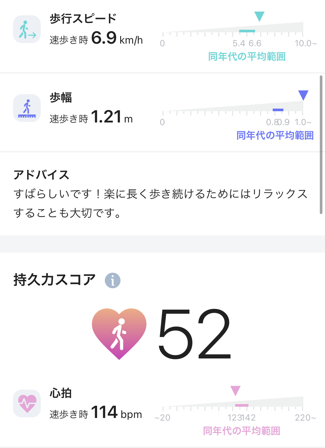 このように、自分の歩行スピード、歩幅、心拍などを、同年代の平均と比較したスコアをチェックできます。大股で早歩きを意識して歩いたので、なかなか良いスコアが出た気がします。(持久力には自信があるのに!と思いましたが、ウォーキング時間が短いとスコアが低く算出されることがあるそうです)