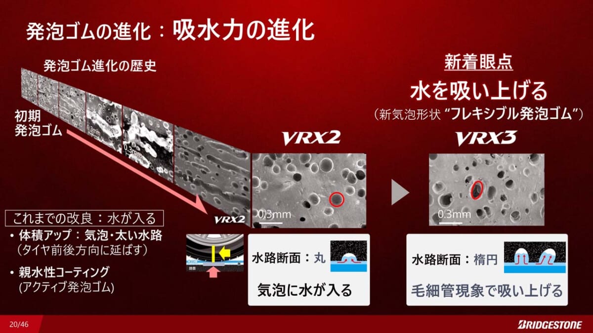 BLIZZAK VRX3はその最新モデルとして、そうした実績を踏まえてさらなる「氷上性能の大幅向上、ライフ性能、効き持ちの向上を実現した新次元のプレミアムブリザック」として誕生しました。ブリヂストンによれば、氷上制動性能を先代「VRX 2」比で20%向上させながら、耐摩耗性などライフ性能も17%も向上させているとのこと。開発陣としては、そのほかにもメインの氷上性能だけでなく、ドライ路面や雪混じりの路面など、非積雪地域での性能向上にも努めたそうで、その性能もぜひ体験して欲しいとも話していました。