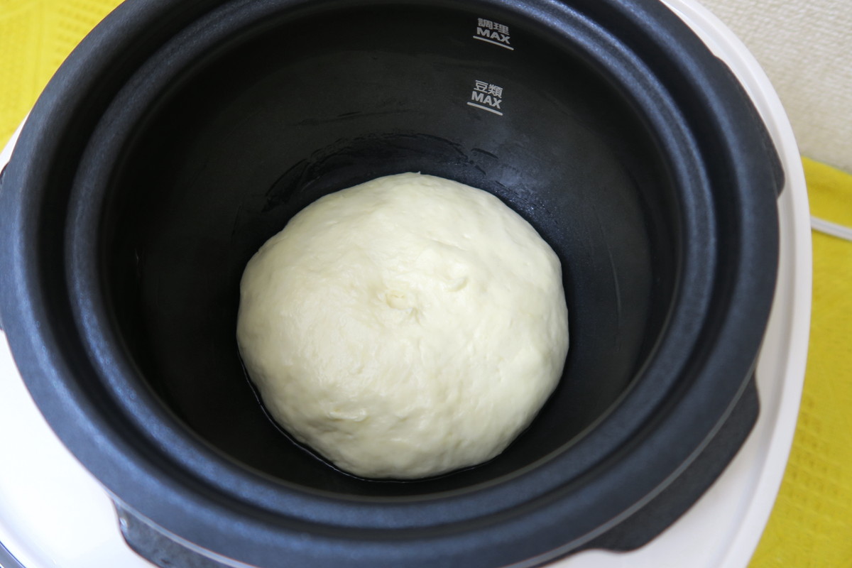 二次発酵を終えた生地は先ほどよりもしっかり膨らんだように見えます。約2倍になっていれば発酵は終わり。あとはフタを閉め、「ベイク」モードの130度で35分焼くだけ。
