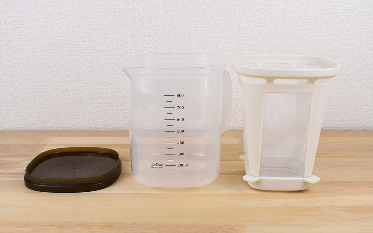取れただしは美しい黄金色。挽きたてならではの豊かな香りが漂います。同商品はフタ付きなので、余っただしを保管しておきたいときにも困りません。また、こし網の底面は取り外すことが可能。だしがらを取り除くのが簡単なため、しっかりお手入れができますよ。