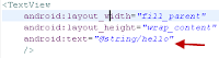 wrap_parent(area objek menyesuaikan bentuk objek). Selanjutnya pada class andorid:text yang ditunjuk panah merah seperti gambar dibawah: