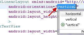 Pada gambar diatas yang ditunjuk panah merah adalah model dari class android:orientation, yang mana pilihannya ada vertical dan horizontal. Untuk menampilkan seperti diatas tekan Ctrl+spasi pada keyboard. Class ini digunakan untuk mengatur letak objek akan mendatar atau menurun. jika vertical seperti ini :