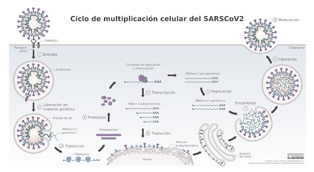 | Arriba representación esquemática del ciclo de infección del SARS-CoV-2. Desde el punto de vista del combate contra la enfermedad, la parte más importante del proceso es el momento en el que el virus penetra en la célula vía dos proteínas de membrana que “le abren el paso” (identificadas como TMPRSS2 y ACE2). Bloqueando esta fase inicial el virus no puede infectar a las células y, por tanto, queda a merced del sistema inmunológico, que procede a su eliminación. Fuente: microBIO. |